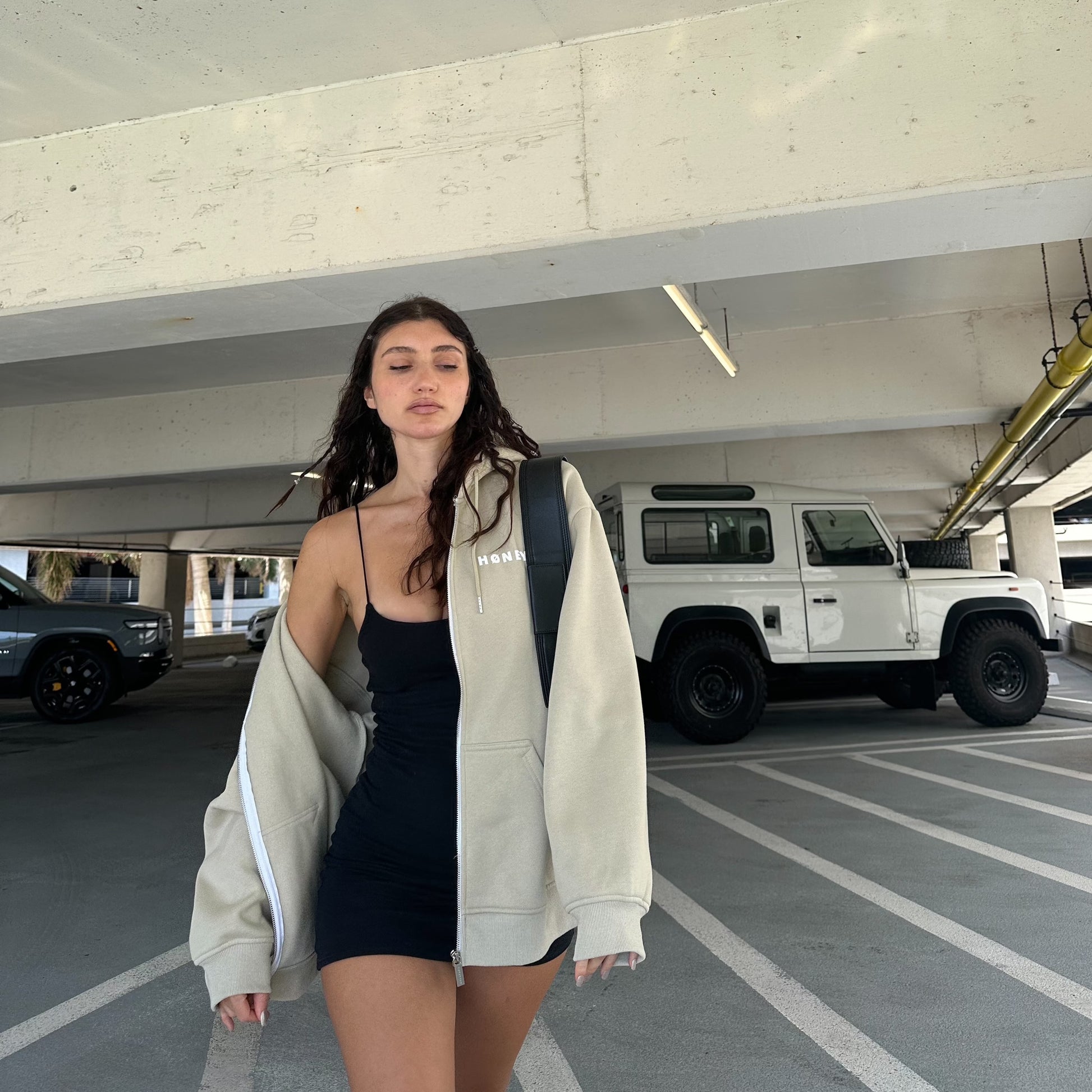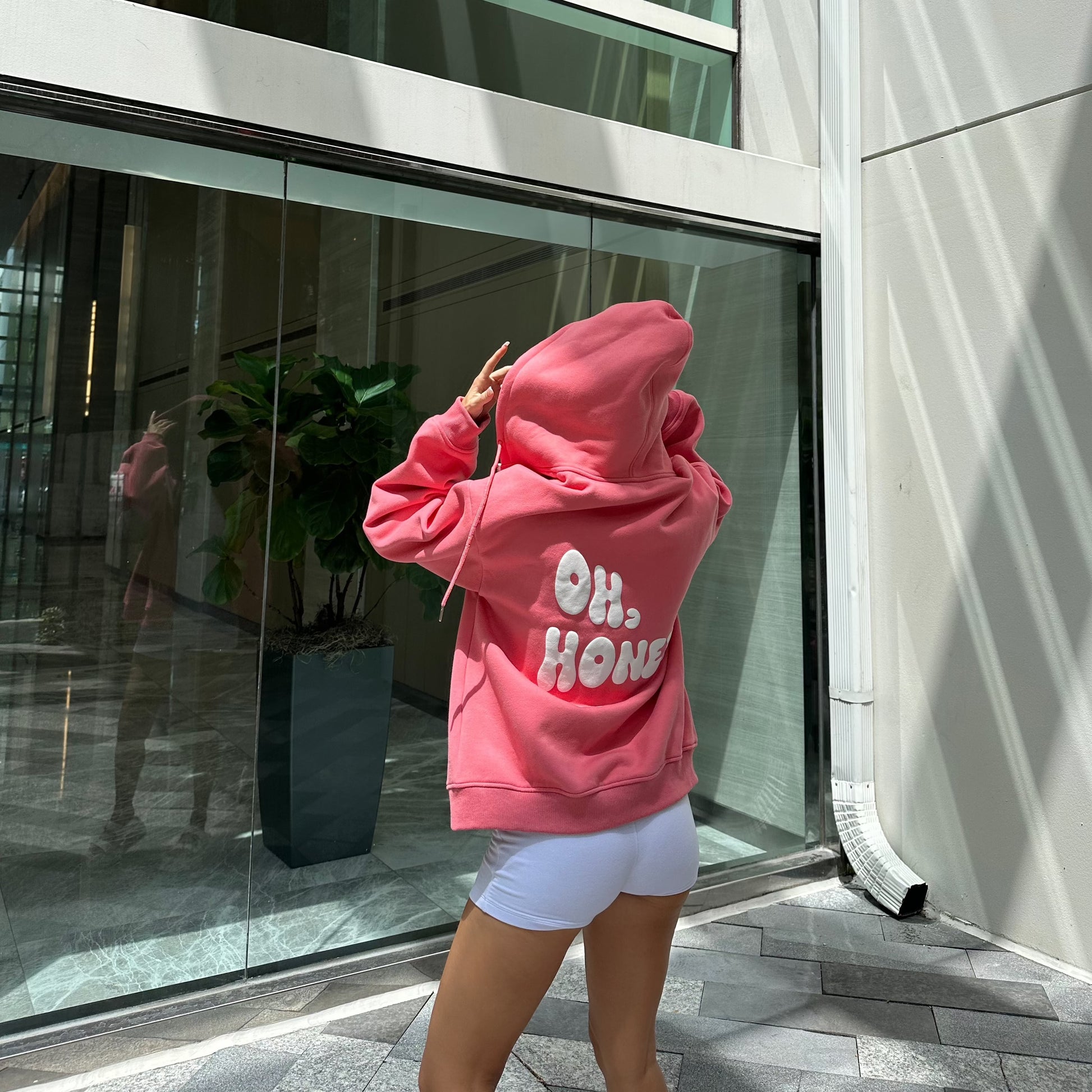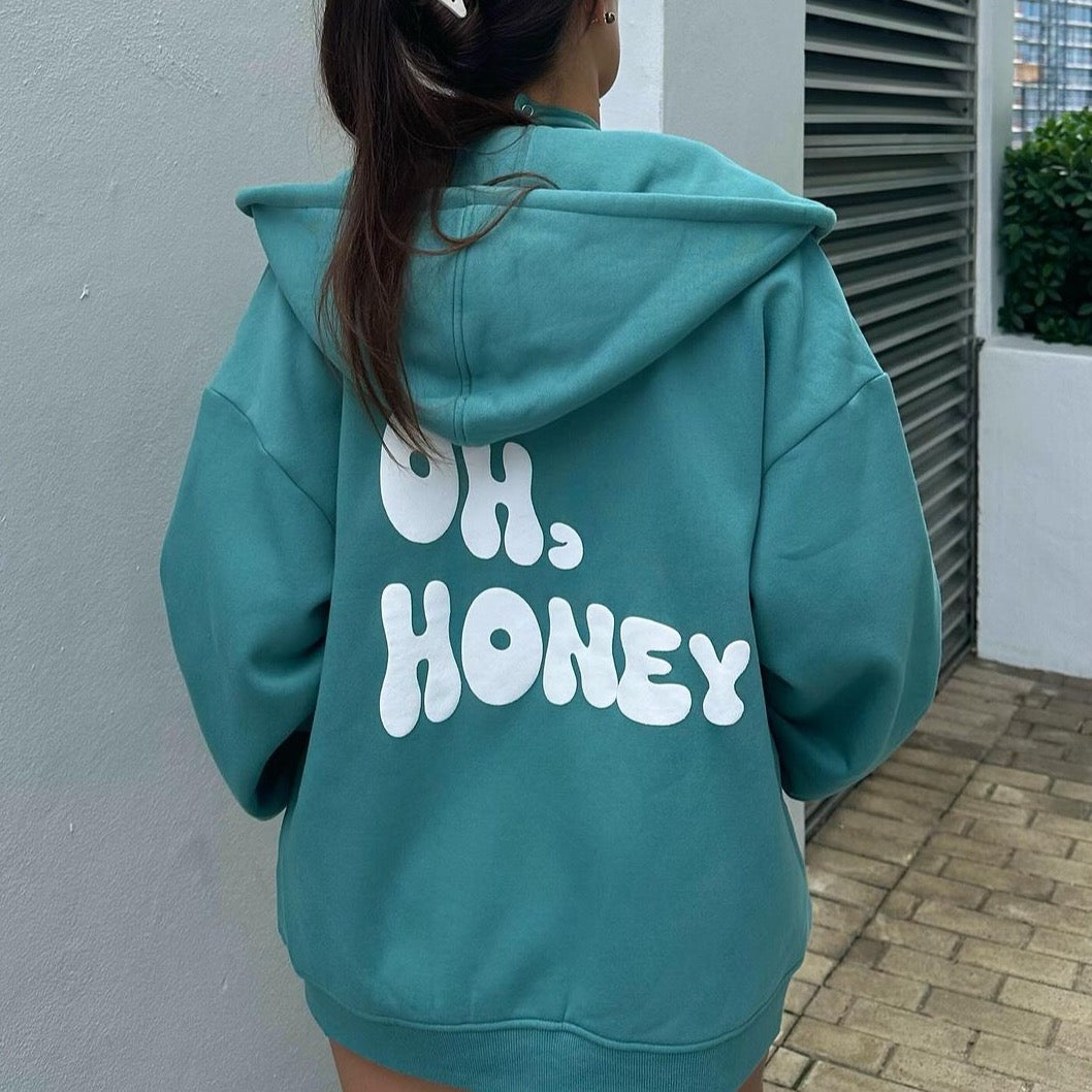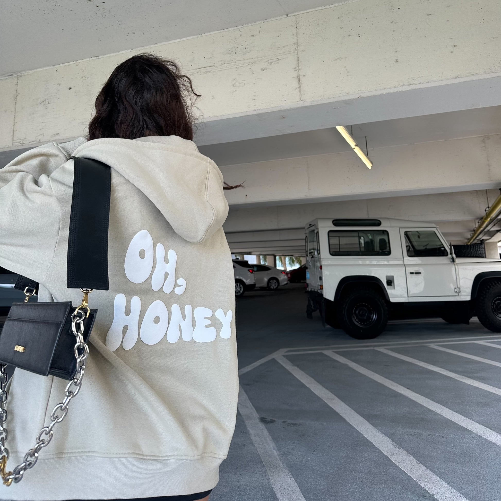 Complete your comfy, clean-girl look with the Billie zip up. Perfectly oversized and cozy. Features "Oh, Honey" text on the back.